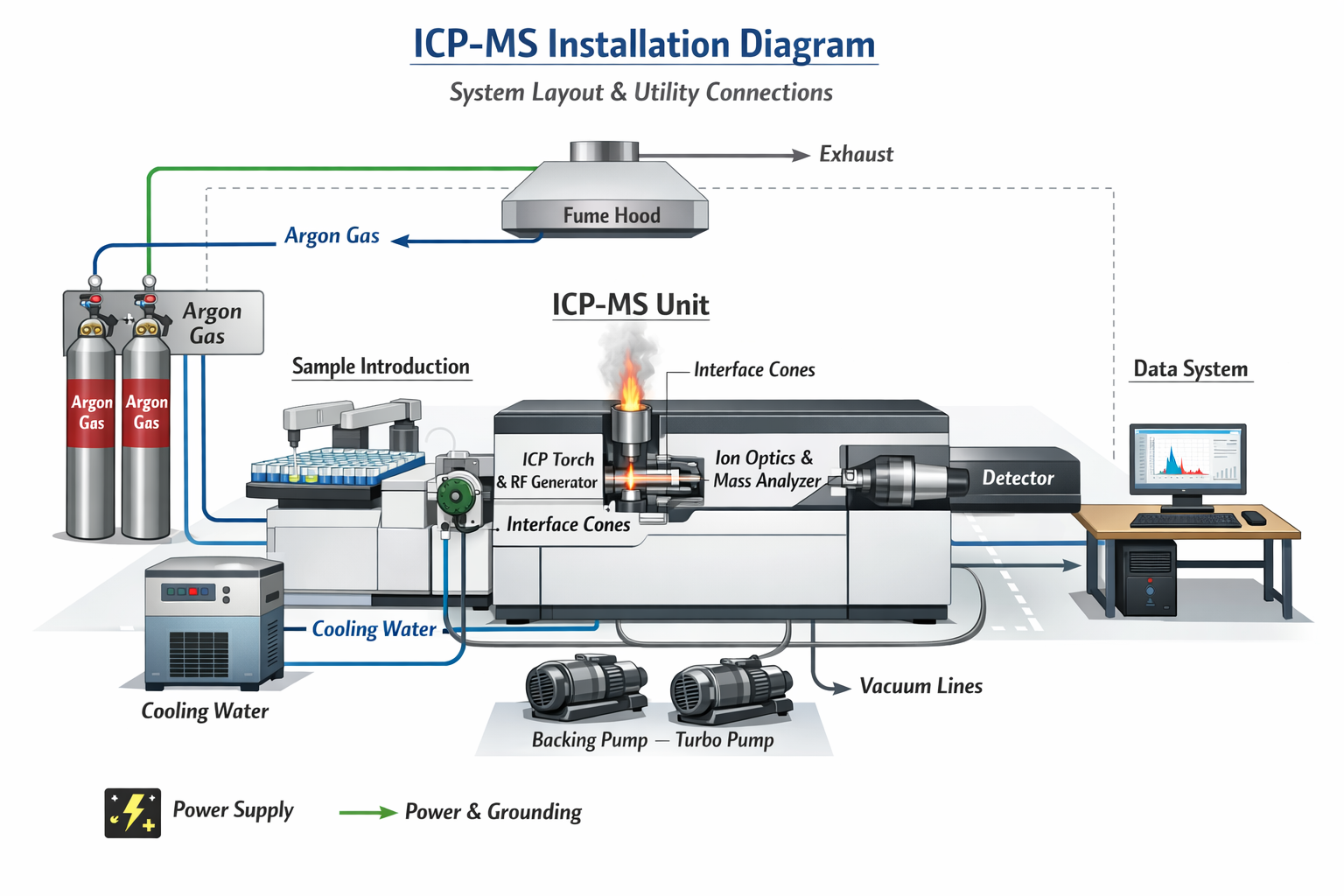 The installation diagram of an ICP-MS (Inductively Coupled Plasma Mass Spectrometer) shows how all major components and utilities are connected to ensure smooth, safe, and accurate operation of the system. A proper installation layout is critical for achieving stable plasma, reliable sample introduction, and precise analytical results.